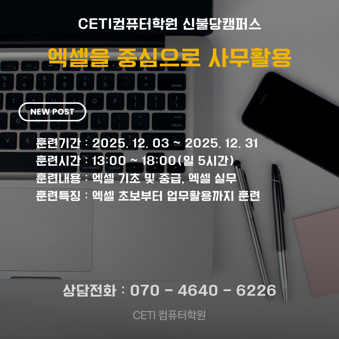 훈련기간 : 2025. 12. 03 ~ 2025. 12. 31훈련시간 : 1일 5시간 / 총 100시간(20일)훈련장소 : CETI신불당캠퍼스(충남 천안시 서북구 불당22대로 92 316호, 317호 (마블러스티타워, 불당동)