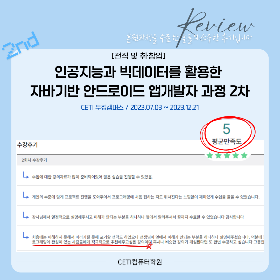과정명 : 인공지능과 빅데이터를 활용한 자바기반 안드로이드 앱개발자과정 2차일 시 : 2023. 07. 03 ~ 2023. 12. 21장 소 : CETI두정캠퍼스주요내용 : 인공지능, 머신러닝, 빅데이터, 자바, 안드로이드, 파이썬훈련 종료 후 훈련생들이 고용24홈페이지에 직접 올린 소중한 후기입니다.자세한 내용은 아래의 링크에서 직접 확인하실 수 있습니다.!! https://www.work24.go.kr/hr/a/a/3100/selectTracseDetl.do?tracseId=AIG20223000856867&tracseTme=1&cstmConsTme=&crseTracseSe=C0061&trainstCstmrId=500020043058&tracseReqstsCd=&focusId=