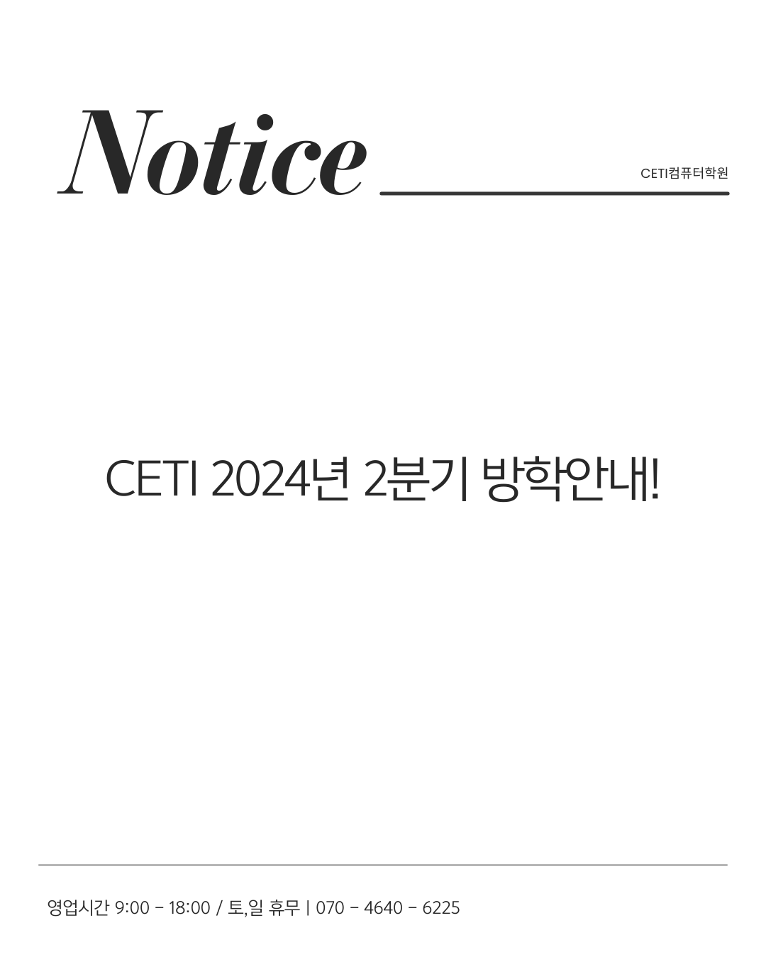 CETI컴퓨터학원의 2024년 2분기 학원방학은 5월 27일 ~ 6월 1일까지 입니다.