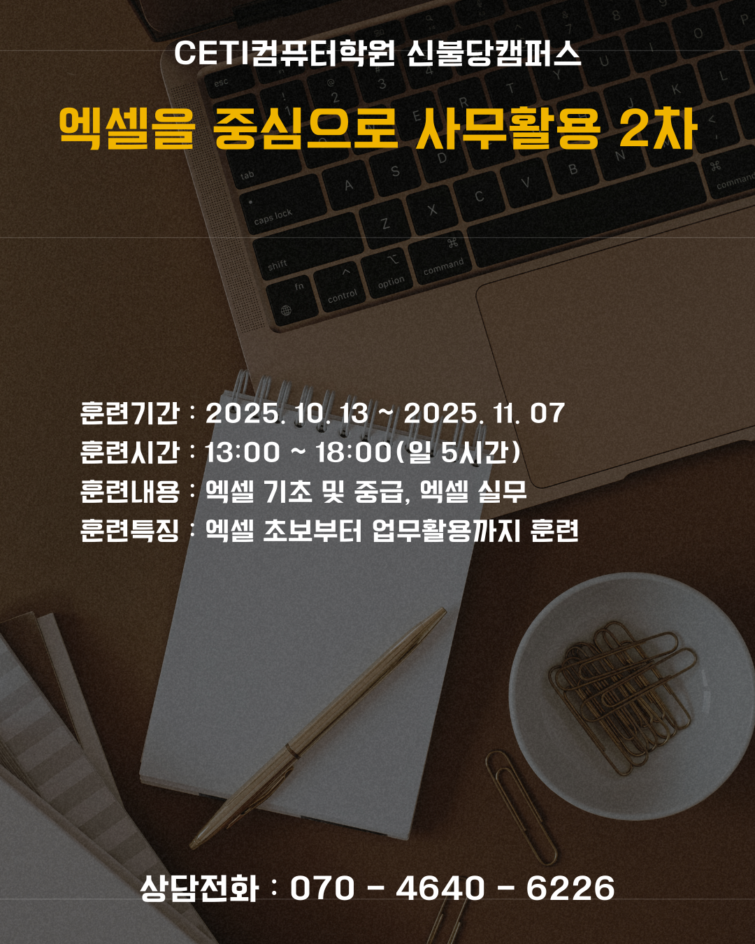 훈련기간 : 2025. 10. 13 ~ 2025. 11. 07훈련시간 : 1일 5시간 / 총 100시간(20일)훈련장소 : CETI신불당캠퍼스(충남 천안시 서북구 불당22대로 92 316호, 317호 (마블러스티타워, 불당동)