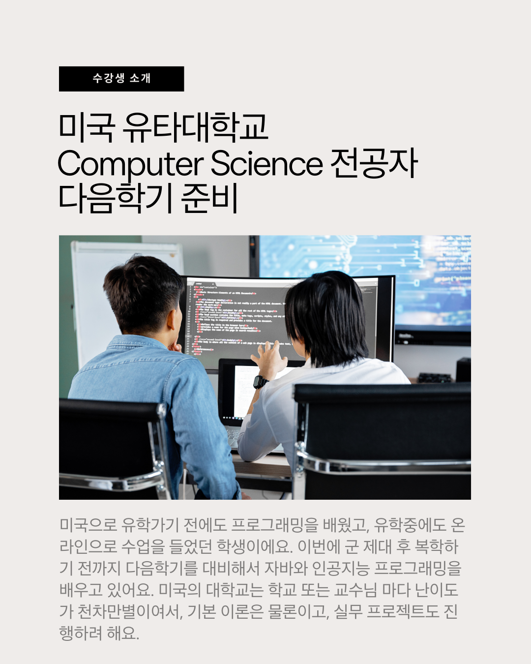 미국으로 유학가기 전에도 프로그래밍을 배웠고, 유학중에도 온라인으로 수업을 들었던 학생이에요. 이번에 군 제대 후 복학하기 전까지 다음학기를 대비해서 자바와 인공지능 프로그래밍을 배우고 있어요. 미국의 대학교는 학교 또는 교수님 마다 난이도가 천차만별이여서, 기본 이론은 물론이고, 실무 프로젝트도 진행하려 해요.