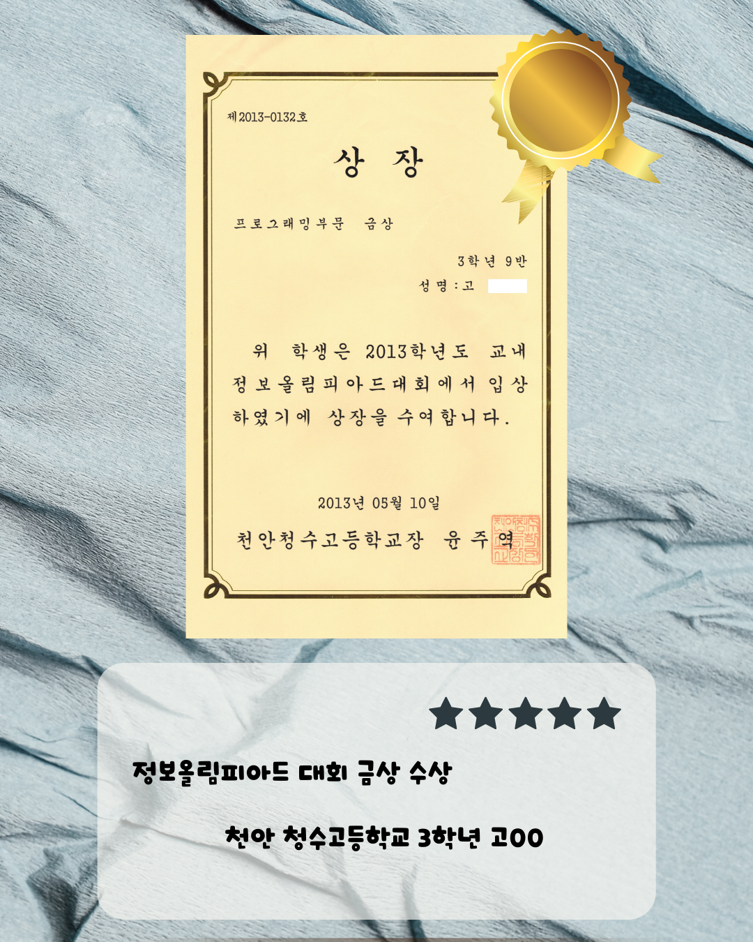 천안 청수고등학교 3학년 고OO 학생이 올림피아드 대회에서 금상 수상