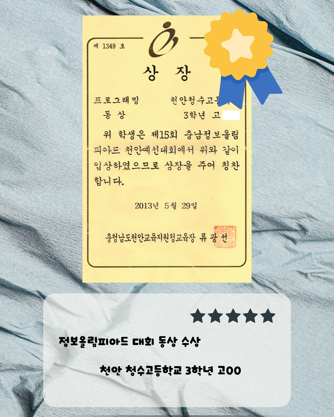 천안 청수고등학교 3학년 고OO 학생이 올림피아드 대회에서 동상 수상