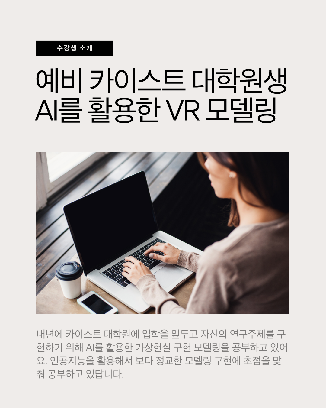 내년에 카이스트 대학원에 입학을 앞두고 자신의 연구주제를 구현하기 위해 AI를 활용한 가상현실 구현 모델링을 공부하고 있어요. 인공지능을 활용해서 보다 정교한 모델링 구현에 초첨을 맞춰 공부하고 있답니다.