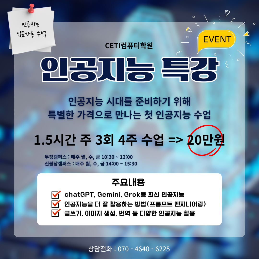 수업장소 : CETI두정캠퍼스 ( 매주 월, 수, 금 10:30 ~ 12:00 )