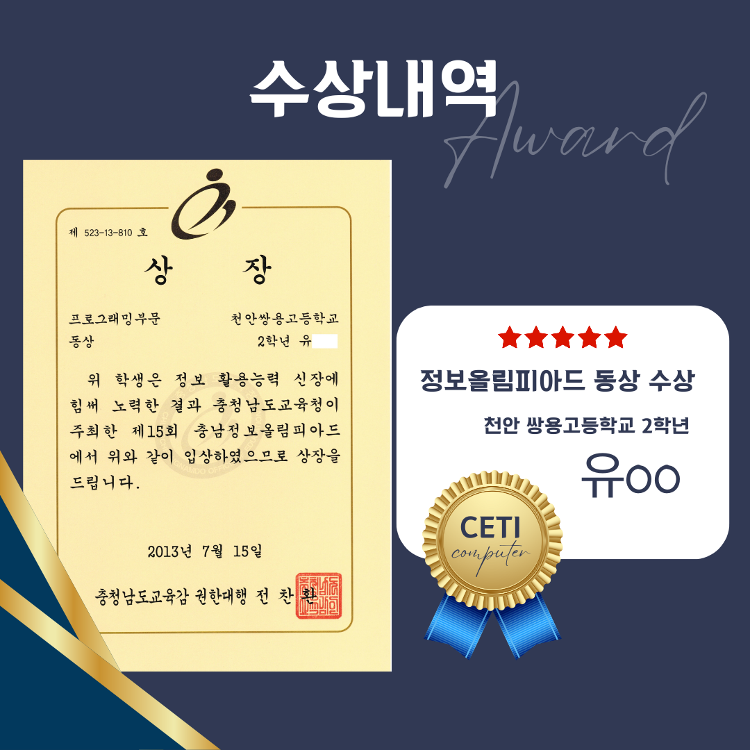 천안 쌍용고등학교 2학년 유OO 학생이 올림피아드 대회에서 동상 수상