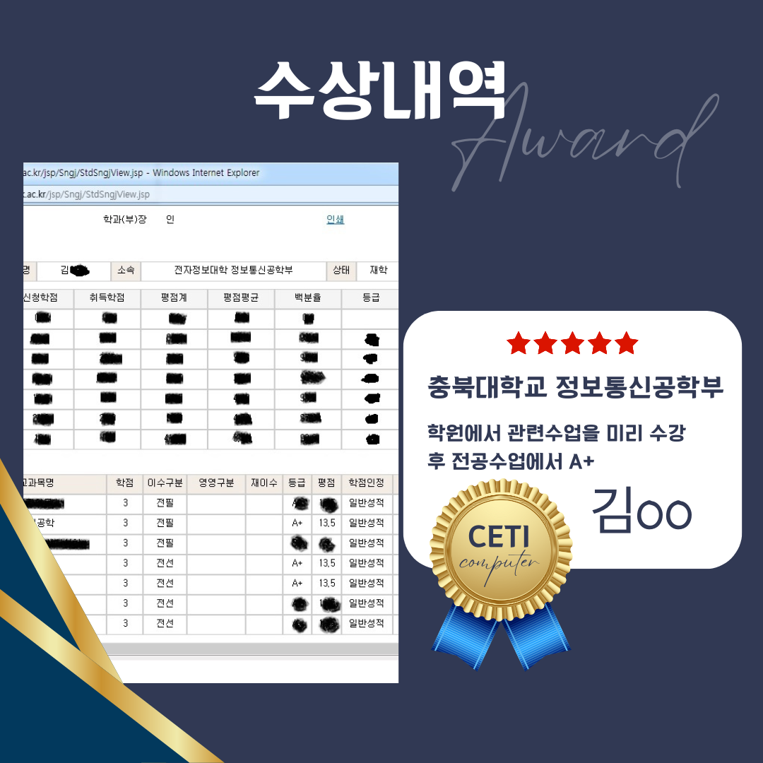 충북대학교 정보통신공학부 김OO 학생이 학원에서 관련 수업을 미리 수강 후 전공수업에서 A+ 받음